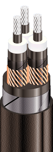 | Three-core power cables with aluminium conductors, with XLPE, steel-tape armoured, with PVC compound outer sheath |