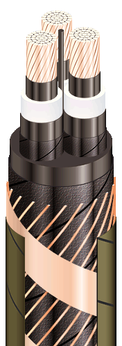 | Кабели силовые трехжильные с медными ТПЖ, изоляцией из сшитого полиэтилена, общим экраном, с продольной герметизацией и наружной оболочкой из ПВХ пластиката, не распространяющие горение |
