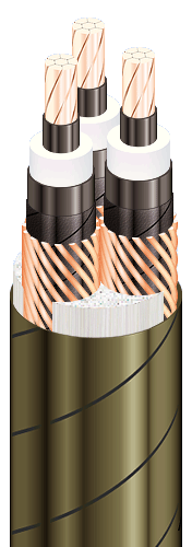 | Кабели силовые трехжильные с медными ТПЖ, изоляцией из сшитого полиэтилена, с заполнением сердечника корделями, c наружной оболочкой из ПВХ пластиката, не распространяющие горение и с низким дымо- и газовыделением |