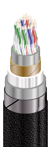 | Кабели сигнально-блокировочные с медными жилами, с изоляцией из полиэтилена, с гидрофобным заполнением сердечника, в алюминиевой оболочке, с броней из двух стальных лент, в шланге из полиэтилена |